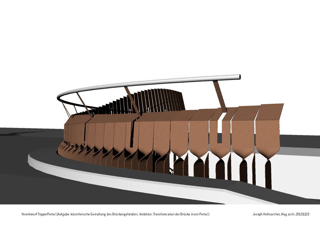 […] Mit dem TöpperPortal wurde die Brücke zur „Schleuse, zum Zwischenraum zwischen der Bundesstraße und dem neu adaptierten Fabriksareal“. Dieses Objekt in Stahl verbindet Tradition und Innovation, Handwerk und Maschine. Einerseits wurde modernste Computertechnik angewandt, andererseits kam auch das alte Schmiedehandwerk zum Einsatz.
